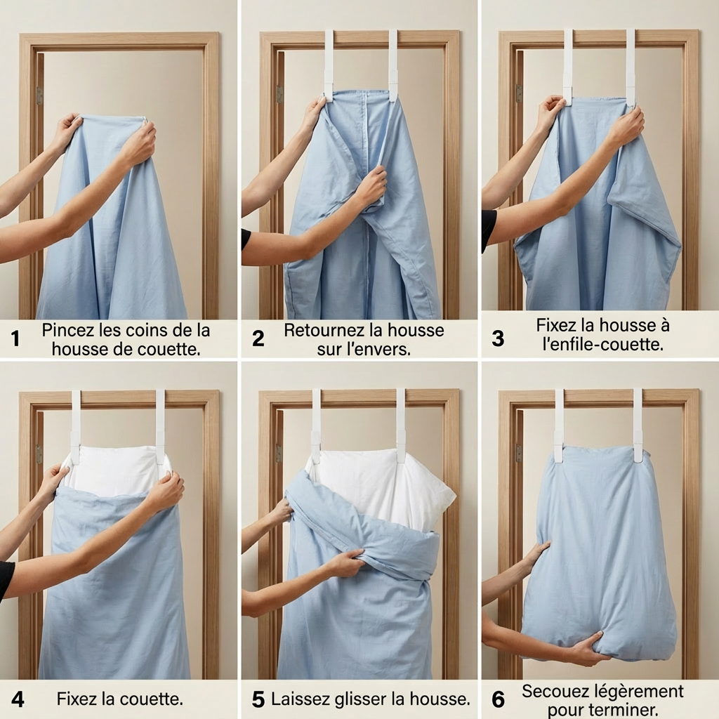 Mettre une housse de couette ne doit plus être une corvée. Avec notre système, vous gagnez jusqu’à 3× plus de rapidité, sans tirer, sans s’énerver et sans aucun effort physique. Compatible avec toutes les housses, même les plus étroites, et conçu en acier renforcé pour durer des années.